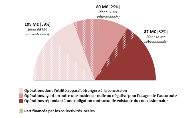 Ces opérations concernent, dans leur majorité, la création ou l’aménagement d’échangeurs et de diffuseurs autoroutiers (484 M€) et des travaux d’amélioration d’insertion environnementale tels que des murs anti-bruit ou des passages à faune (237 M€).
